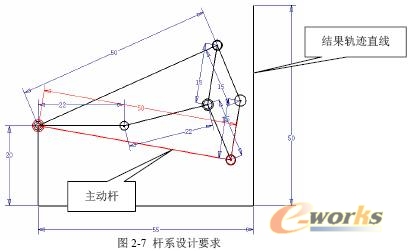 图2-7所示是一个能产生精确的直线运动的杆系的模式图,设计目标是杆系最右边的端,能沿着右边50mm高的竖直线运动。附件中有“平动机构的设计过程\概念.AVI”,播放这个文件,可见设计的最终要求(杆系的运动情况)。