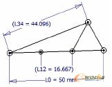 其中,50mm是原始设计数据,L12长度的三条线是“等长”约束的结果,而右边的三角形也是等边三角形。这样L12杆实际上是6根,L34杆两根,连结相关的铰接点就行了。
