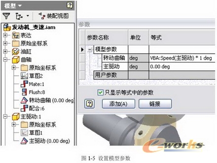 7) 在参数对话框中将“曲轴转动”约束与变量约束“主驱动”建立等式“VBA:xx1 (x)*1deg”,参见图1-5