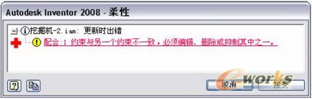 对选定的柔性部件,也能通过相同的方法将柔性部件改变成非柔性部件。不过要注意,上面将油缸子装配设置成柔性,只是因为在这个装配中会有两个以上的位置引用这个子装配,而它们各自的动作结果并不相同。如果将这样条件下的油缸由“柔性”改成“非柔性”会报告错误提示(参见图1-13),而且这样做完全不符合正常的思维逻辑,驱动时也将发生错误。