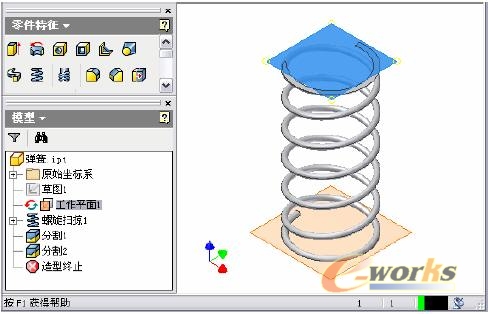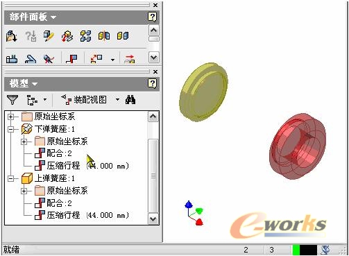 2) 然后打开模型文件弹簧装配-1.IAM,这个装配包含两个控制弹簧两端的零件,它们之间的关系也已经定义完毕
