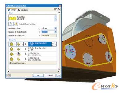 运用完善的滚子链条、链轮与惰轮资源库设计滚子链条传动器。此经改善的产生器预览功能,会显示资源库里的每个链条的尺寸与强度曲线,以协助使用者选择正确的链条,满足传动功率与速度的需求。