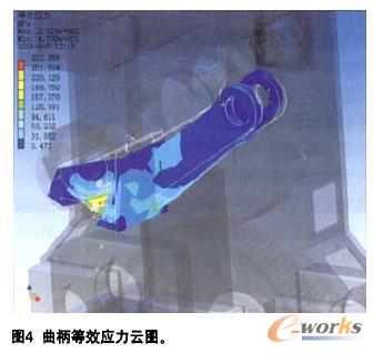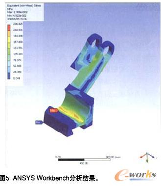 利用图表中搜索出的最大应力加载到曲柄,并定义曲柄约连接点,双击曲柄进人零件应力分析环境,点击"运动载荷",软件就会自动加载运动仿真中零件受力状况进行受力分析,由于设计的曲柄属于不对称结构,通过有限元云图我们清楚看到受力偏载的情况,同时发现曲柄与曲轴连接处设计不合理,需要进行设计修改加厚连接处(见图4),并出具相关问题修改报告。 结论 现在我们来做一个量化的对比。我们把模型导人目前市面比较主流的ANSYS Workbench 10.0,利用作用力与反作用力的原理添加相应的约束和力学条件进行分析,发现两款软件分析出的受力趋势和结果相差无几,AIP11的应力值相对保守一些,看来AIP11虽然是一款设计软件,但是其力学分析能力还是值得信赖的(见图5)。   通过起停式曲柄飞剪机的实际设计,希望广大读者理解如何使用AIP11的运动仿真模块,清楚整个操作流程,解决实际设计中困扰我们的问题。AIP11作为一款三维机械设计软件,很好提供了从产品研发到校核,并出具与设计相关分析报告的一套合理解决方案,在提高产品质量的前提下,优化了设计流程。作为一款设计软件,模型的修改异常简单,随着修改就可以直接分析得出需要的结果,同时伴随设计调整,从零件到装配,甚至指导生产的工程图都会关联更新,这是任何一款CAE软件无法比拟的。