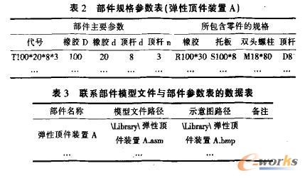 3.2部件库实现 部件库的实现包括部件模型和数据表的创建。部件的驱动模型需以下两步: (1)在Inventor中创建一个装配件,为其命名,如"弹性顶件装置A.iam"(iam为装配件文件的扩展名),调人零件库中的iPart零件,最后在各零件之间添加适当的约束。利用Inventor提供的自适应技术,部件中零件的部分尺寸可以从装配关系中得到,而不必一一指定。运用此技术,可以方便地创建更加灵活和适应性更强的部件模型。 (2)定义部件在装配时与其他零件的配合关系。例如,上述弹性顶件装置装配到模具上时需要三个约束:①弹性顶件装置的中心轴线与下模座上螺钉孔轴线重合;②其中一个顶杆的中心轴线与下模座上一个顶杆安装孔的中心轴线重合;③顶杆末端面与顶件块下端面贴合。定义了装配关系后,用户就可以很方便地把部件装配到其他装配件模型中了。Inventor提供了iMate功能,专门用来对各种类型的约束进行预定义。 数据表可以使用多种数据库系统软件来开发,本程序使用的是MS Aceess数据库。以图2所示的"弹性顶件装置"为例,创建的两个数据表如表2、表3所示。