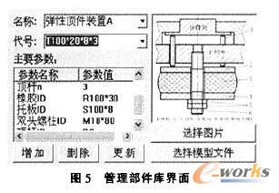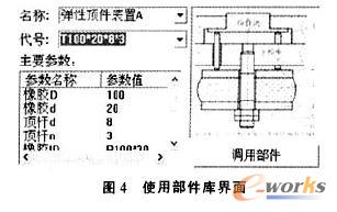 4部件库系统实例 根据上述方法,开发了冲压模具部件库系统,其功能主要包括使用和管理两部分。 使用部件库界面如图4所示。通过此界面,可以选择部件的类型和规格,查看所选部件的参数以及将其调人Inventor操作环境中。