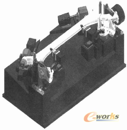 在Inventor 三维环境中,在初步方案的基础上,通过计算确定所需的液压、气动元件及在夹具地盘上的空间位置,很快就建立了夹具装配的三维模型,非常直观地表达了夹具装配部件完整的三维信息(见图1)。因为Inventor 三维模型的信息要比二维设计丰富得多,修改也非常方便,如果夹具方案变化,只要在Inventor中修改一些参数,新的方案下的设计就完成了。通过审核基本配合、机构运动模拟、零件分析等,可确定设计的合理性。审核完成之后,再对零件进行相关的细化设计。如退刀槽、零件减重部分等,最后投影生成工程图,完全符合整个夹具设计的工作流程。使用Inventor 软件形成的效果图见图2 。