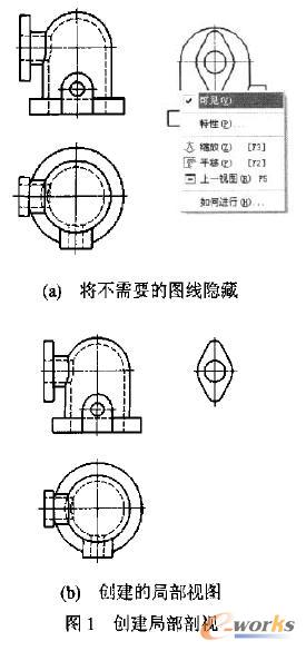 | | 近几年来,三维建模被许多高校引入到制图课。三维CAD的到来,对二维图形似乎是一个很大的冲击。如何处理好二维和三维的关系,对于目前的制图课程是很重要的。三维CAD软件可将创建好的三维模型直接转换成二维工程图,并且与三维模型相关,修改三维模型,工程图也随之改变。但三维软件在将三维模型转换成二维工程图时不可避免地会遇到许多问题。转二维是三维软件最难作好的,其中的一个主要原国是二维工程图有许多人为的规定,这些规定与真实的情况可能并不相符。例如沿肋板的纵向剖切时,不画肋板的剖面符号,而是用粗实线将其与其他部分隔开就与真实情况不符,而三维软件是按真实情况处理的。这就需要进行修改。作者基于Inventor讨论了工程图表达时所遇到的问题及处理方法,同时也论述了一维工程图的重要性。 1三维转二维所存在的表达问题及处理方法 将三维模型转换成二维工程图要比用二维软件直接画工程图快得多,即使加上三维建模的时间可能也比后者效率高。但是目前的三维软件转二维会遇到一些问题,在很多情况下得不到令人满意的、符合标准和习惯的工程图,这些问题包括表达法和尺寸标注等方面的,所幸的是Inventor允许在工程图环境下进入草图模式对工程图进行修改,下面首先指出问题,再提出修改的办法。 1.1局部视图 Inventor可以方便地创建基本视图、方向视图,但创建局部视图和斜视图都会遇到问题。例如图1(b)的局部视图,不能直接创建,而只能是创建了左视图(图1(a))后将其余的线条隐藏后得到。可以在选中要隐藏的线条后按右键,在弹出的菜单中选择"可见",如图3所示。Inventor有创建"局部视图"的命令,但那是创建"局部放大图"的,说明译文也是不准确的。