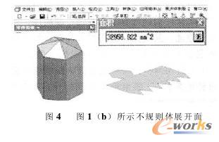 2不规则体表面的展开 Inventor支持开放的应用程序接口(API)。在Inventor中,嵌入了完整的VBA程序设计模式,这是一个强大的开发工具,通过VBA语言进行二次开发,实现了立体图的展开,图2中所示的"体表面展开"标题栏就是二次开发后添加到Inventor中的。