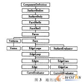 Inventor实心体是用边界映像(Brep)来定义的,因此由体展开成平面是通过依次遍历所有构成该体的几何图形元素,包括:体、特征(体生成方式:拉伸、旋转、平移等)、面、面圈、边圈(edgeloop)、线、点,创建树的结构,如图3所示,并把信息参数存放在数据结构里保存起来。当数据结构中提示某个面被用户选择展所有边以及每个边上的点的特征参数,将所有点进行三维矩阵变换,使得任意一角度空间平面所有点的数据,转换成俯视图的投影点数据,利用这些点的数据创建各个边。将各个边连接成边圈,将这个展开面的所有边圈定义成一个轮廓(profile),一个轮廓对应一个面。依次遍历所有选择要展开的面,创建相应的Profile。
