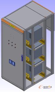 3)、对于特征,当要抑制某个特征时,输入suppress,否则输入compute。因为没有提供选项,所以需要手动输入。当分别对各个零件进行iPart编写后,就可以进行iAssembly的编写了。编写的方法和iPart大同小异,也是通过iAssembly编写器进行编写,如图(5)所示,在图(5)中可以看到框架装配部件中有多个iPart零件,他们通过iAssembly组合在一起,分别对各个iPart零件指定不同的配置,就会得到了不同配置的两种框架部件组合,分别为框架部件-01、框架部件-02。在图(5)中还可以看到iAssembly中有零部件、参数、特性、排除等七个选项栏,这几个选项栏设计的非常到位,能够满足生成iAssembly的用户所有需求。图(6)图(7)就是我们应用上述iPart和iAssembly方法设计的2种电气柜方案,在2种方案中,无论是外形尺寸,还是里面各零部件的配置都是不同的。通过和以前设计时间的对比,设计周期缩短为原来的1/2,设计师的设计量减少了1/3。纵览国内的制造业,和我们一样,对系列化问题苦恼的厂家比比皆是,无论是电气制造业还是其他的机械加工业。AIP软件的这个功能是一种最好的解决方案,非常值得借鉴和引用。