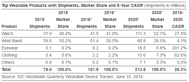 手表:在Apple Watch、Moto 360和其他产品的推动下,智能手表占可穿戴设备市场的份额将从2016年41.0%上升至2020年的52.1%。不过,并非所有手表情况都是如此。尽管智能手表是当前的热点,但未来的增长将来自基本款手表。这样的手表提供了运动和睡眠追踪功能,但并不足以运行第三方应用。传统时尚品牌,例如Fossil,以及运动手环厂商,例如Fitbit和Withings将协助这一领域的增长。