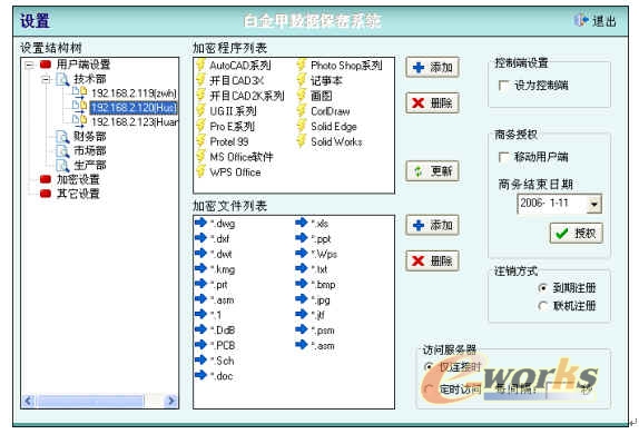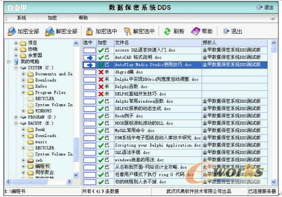 产品概述 金甲数据保密系统(DDS)是武汉风奥软件技术有限公司针对企业数据保密需求推出的一套简单易用的数据保密解决方案。金甲数据保密系统(DDS)支持Win2000/XP/2003操作系统,可以自动加密用户指定的任意Windows文件格式(如*.dwg;*.txt;*.doc;*.prt)。金甲数据保密系统(DDS)通过服务端可以方便地实现密钥管理、加密策略分发、控制端授权、外出商务授权等功能。金甲数据保密系统(DDS)的使用不会影响操作者原有操作习惯,保密环境建立简单、管理方便。是企业数据保密理想的解决方案。 试用下载:http://www.fasoft.cn/download/DDS.rar 主要特点 1.设置严密 ●指定类型文件打开、移动、拷贝等操作过程中自动加密; ●用户端安装后,不能选择不加密,指定类型文件强制加密; ●用户端对使用者不可见,不可卸载、停止; ●只有在服务端登记后的控制端才能解密文件; ●只有在线控制端用户才能解密文件; ●控制端加解密文件时自动向服务端写日志; ●限止任何非法程序访问密文; ●用户端只有通过认证方能进入系统; ●非法用户端试图访问服务器时自动拒绝、报警; ●控制端、服务端操作需要合法登录。 2.安全可靠 ●服务端提供与硬件相关的全球唯一密钥,不可复制; ●密钥不在硬盘上出现,密钥传输过程采用当今最先进的AES算法加密; ●对文件加密采用全文加密技术; ●密文中不带密钥,从密文中得不到文件破解的任何信息; ●程序提供多种加密算法,对文件加密时,随机选取加密算法; ●提供用户增强自定义密钥功能; 3.适应面广 ●支持对所有Windows文件加解密; ●用户可自定义加密程序和文件类型; ●可设置部门之间的加密,也可以设置部门之间密文共享; ●免去增加应用程序需要开发功能的烦恼; ●免去由于应用程序升级带来的软件升级烦恼; 4.使用方便 ●用户端对使用者完全透明; ●对文件操作过程中自动加密,合法打开文件自动解密。加密时不需要指定加密文件,解密时不需要输入密钥; ●密文在加密环境许可的范围内不需要做任何处理交流无阻。 ●提供移动办公的商务授权策略管理; ●所有管理都设在服务端,不需要到每个客户端去操作; ●图形化界面,易学易用。 5.管理简单 ●用户端加密策略、控制端登记、商务授权等设置都在服务端进行; ●只要修改加密策略(单位、部门、个人),在线用户立即生效; ●提供备用服务器,主服务器发生故障时自动访问备用服务器; ●文件请求解密采用网络通讯在线进行; ●海量日志管理功能; 功能简介 1.服务端 服务端用于管理单位独立的加密环境,提供相应的加密策略。服务端的主要功能如下: ●进行软件注册; ●提供单位文件加解密唯一密钥; ●记录服务端重要操作及所有控制端加解密操作日志; ●查看用户端登录情况; ●设置企业加密程序、文件类型; ●对每个用户端进行加密策略设置; ●对控制端进行登记控制,未登记控制端不能进行解密操作; ●对移动用户端进行商务授权; ●对用户端访问进行控制; ●用户端选项设置; 服务端设置界面如下: .jpg) DDS提供备用服务端。备用服务端功能与主服务端功能相同,当主服务器发生故障时,备用服务器自动启用,保证加密环境不受影响; 2.用户端 用户端用于计算机指定数据自动加密和解密。用户端对使用者来说是完全透明的,安装后见不到相应的程序,会随windows的启动自动启动。用户端的加密文件类型、访问方式、离线策略由服务端控制。用户端一旦启用,不能停止; 3.控制端 控制端用于对外正常交流文件的解密。由于系统内的文件都是加密的,当需要对外进行交流时只有通过控制端解密后外部方能打开文件。控制端可以安装在任何一台计算机上,可以与用户端同机,也可以单独使用。控制端必须经过服务端的登记后方能启动。 控制端的使用界面如下图所示: .jpg) 控制端会根据服务端的设置自动筛选出有权操作的文件。对文件加解密时可以选择部分文件,也可以一次性将指定文件夹下的所有文件进行加解密。 控制端的加解密操作会自动向服务端写日志,日志对控制端而言是无法查看和删除的。 控制端只有在加密环境中取得正确的密钥后方能进行加解密操作。 4.DDS工具 为方便DDS的使用,DDS提供了相应的工具。工具包括如下几个方面: ●用户端卸载工具。用于用户端的卸载; ●一次性扫描加密工具。可在安装用户端后对用户端指定文件全部加密;