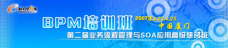 为了帮助企业了解BPM和SOA等相关技术的应用与发展,帮助企业对业务流程进行分析和优化,客观的分析现有信息系统的问题和改进途径,解决信息系统间数据和流程的集成,进一步推进企业信息化的应用效果,e-works定于8月23-25日(周四-周六)在海滨城市――厦门举办“第二届业务流程管理与SOA应用高级研讨班”。诚挚的邀请企业主管信息化和管理规划的各位领导莅临。(更多详情请浏览:http://www.e-works.net.cn/tbbd/bpm070711/index.htm)