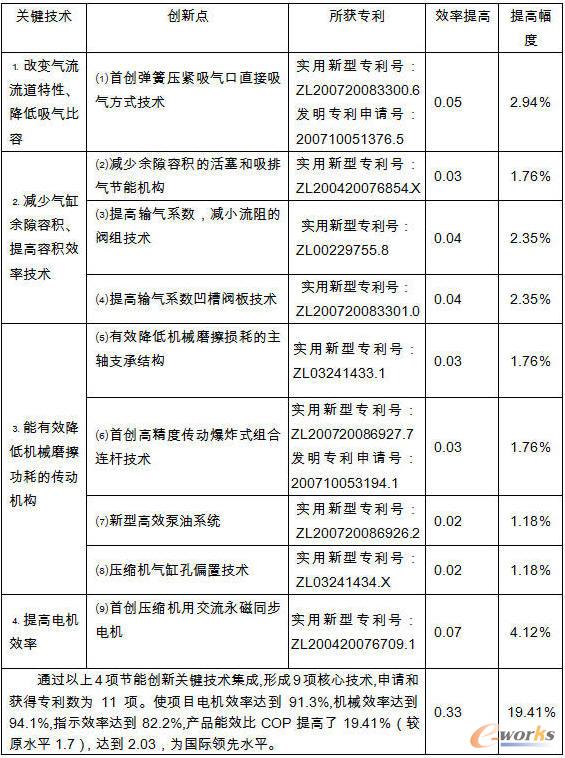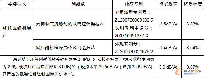 本项目是对17项核心技术进行集成创新,开发出环保节能节材型电冰箱压缩机。该项目具有完全自主知识产权,其自主创新技术在总体技术中所占比重为100%(其中产学研所占比重为30%)。本项目获得22项专利,其中发明专利1项、实用新型专利13项、外观专利3项,均为本项目独有。该项目产品的技术创新点:
