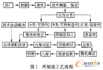 工程机械主要应从发动机、传动系统、液压系统、工作装置等方面施实再制造。制定具体的零部件拆卸、清洗、回收处理方案、回收处理工艺、回收物流管理、失效预测、失效机理、寿命预测等再制造工艺流程。
