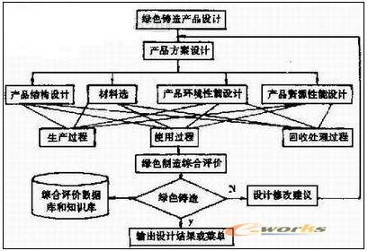 绿色设计,通常也称生态设计(Ecological Design,ED)、环境设计(Design For Environmental,DFE)、生命周期设计(LifeCycle Design,LCD)或环境意识设计( Environmental Conscious Design,ECD)等。图1为铸造业中绿色设计的体系结构框图。