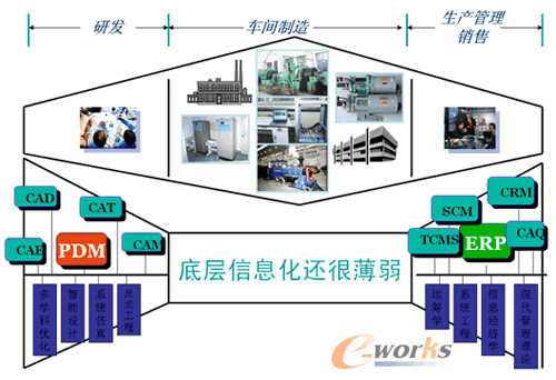 以ERP为例,我们知道ERP的推进面临着很多问题。因为与制造车间的脱节,很多企业在实施ERP的时候无法获取符合实际制造条件的产品信息,无奈之下只好从PDM/CAD等获取未处理的产品信息,事实上设计者理解的BOM和从工艺角度、制造角度理解的BOM差异很大,根据这个设计BOM做的计划难以被接受。再就是我们计划执行的时候需要知道资源和制造过程的信息,因为现在底层的信息化不行,现在还不能让车间把设备故障等信息实时的采集起来,这就很容易造成计划执行不下去。