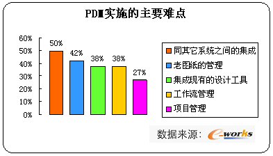 由于PDM/PLM的核心是对企业所有与产品有关的数据进行统一管理,所以PDM/PLM实施的第一个难点就是要解决的就是CAD/CAPP/CAM等系统的集成问题,为这些系统搭建一个平台,实现它们之间数据的互联互通。其面临的第二个难点是,由于PDM/PLM系统出现较CAD等系统晚,企业在实施时,就需要解决这些老系统的数据如何导入到新系统中,进行统一管理,而老数据由于数据标准、格式等问题,如零件模型是用体素拼起来的、没有使用参数驱动、特征之间不关联……,使得这项工作的难度加大。从E-works的一项调查结果中我们可以证实这个问题。
