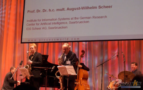 SCHEER教授的演讲以爵士乐队的演奏开场,并在每个部分插入一首爵士音乐,形式别具特色。他用交响乐和爵士乐来比喻传统固化的企业应用软件和基于SOA架构的新型应用软件的变化趋势。 |